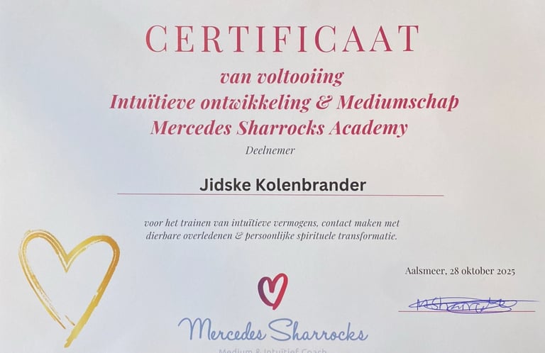 In 2016 ben ik begonnen met de opleiding Intuïtieve Ontwikkeling. Nog steeds volg ik cursussen op het gebied van mediumschap om mijzelf te blijven ontwikkelen.